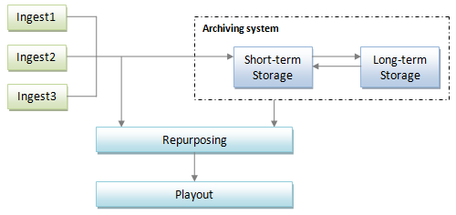 During this process, the content is retrieved from archive and played out with specialized archiving systems used to manage the process. The content goes through multiple stages, many of which may potentially introduce errors. If the content is moved to the short-term storage then errors may be introduced during this stage. If the content requires repurposing into a specified format, then again faults related to quality or format compliance may be introduced into the content. Some of the issue requiring monitoring could include blockiness, codec conformance, parameter value validation etc. Pulsar can monitor the content at different stages in this workflow and analyze it using customized testing rules. The following figure shows a typical workflow from Archiving to Playout: